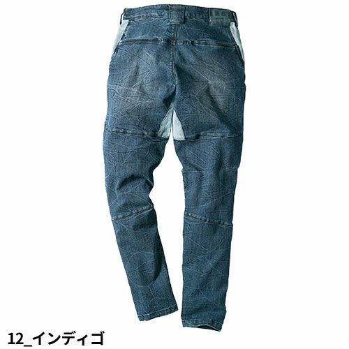 製品洗い加工を施した風合いのある超ストレッチデニムとなっています。伸縮性のあるストレッチ素材を使用しており、ジャンパーの袖内側・パンツの内股ギャザーで抜群の動き易さを実現していますので、激しい現場作業でも邪魔になりません。左袖にはマルチポケットがありますので、現場道具などを持ち歩くのにも大変便利となっています。