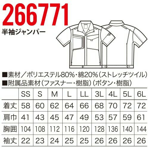 作業服 ブルゾン クロダルマ 半袖ジャンパー 266801 作業着 春夏 リサイクル繊維 ストレッチ 軽量 男女兼用 静電気帯電防止