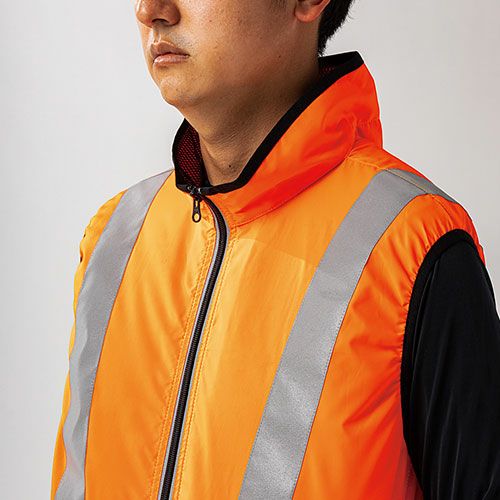 JIS T-8127に適合したオレンジの高視認性安全ベスト 反射テープも採用し昼間および夜間の視認性をアップサイドファン、背中側に保冷剤ポケットで熱中対策にも効果的
