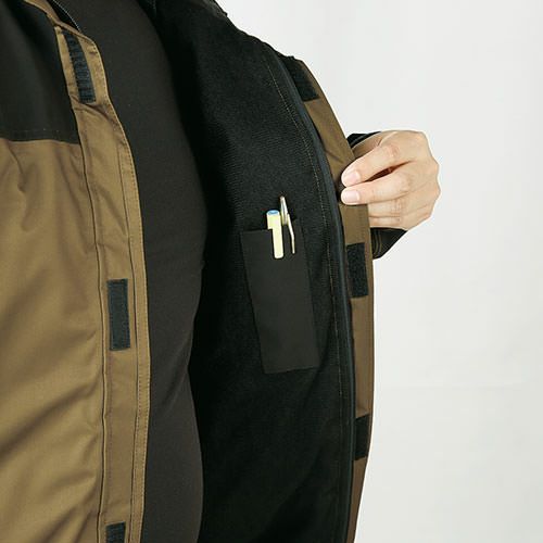 冬の厳しい風や雨から着る人を守る3層ボンディングとなっており、収縮性のあるストレッチ素材を採用しています。このストレッチジャンパーでは、背中の裾部分は反射プリントが貼りつけられているため、視認性を確保しづらい夜間作業時においても安全性を確保することができます。また、左袖にはペン差しがあるため筆記をする際に便利です。袖口ストレッチバインダーテープ・ハンドウォーマーポケット・裏地フリース素材など防寒対策も充実しています。
