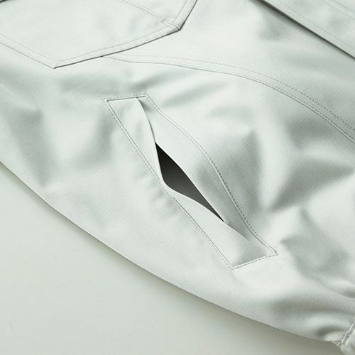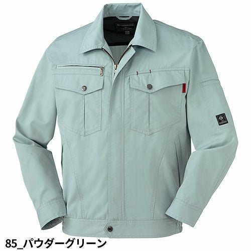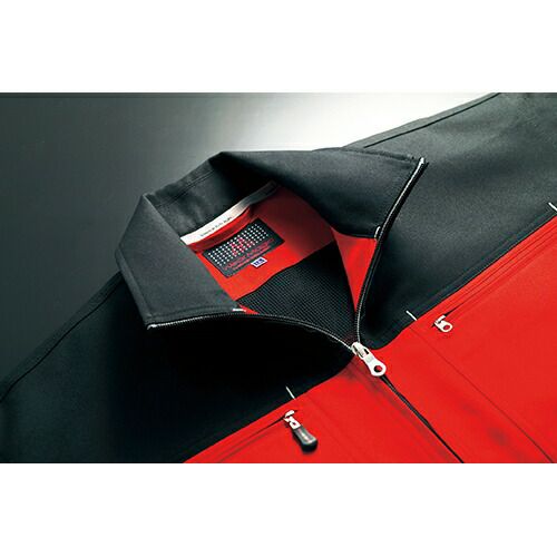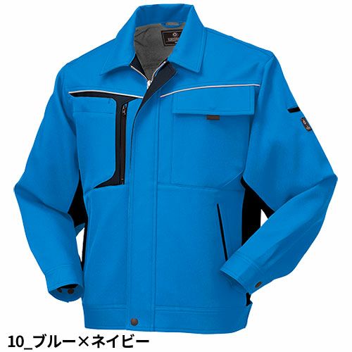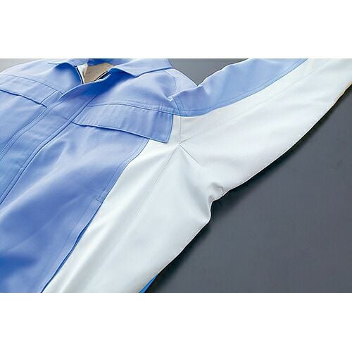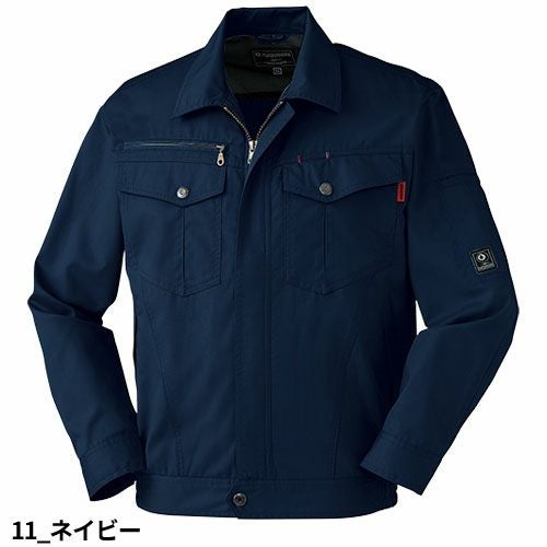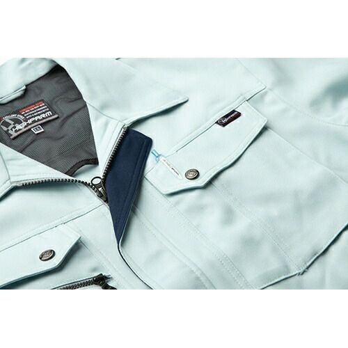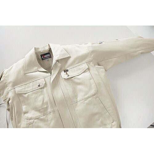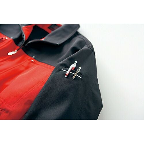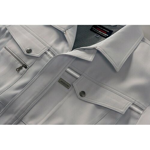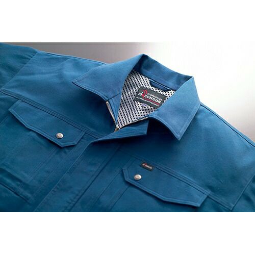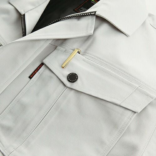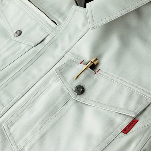 製品洗い加工を施した風合いのある超ストレッチデニムとなっています。伸縮性のあるストレッチ素材を使用しており、ジャンパーの袖内側・パンツの内股ギャザーで抜群の動き易さを実現していますので、激しい現場作業でも邪魔になりません。左袖にはマルチポケットがありますので、現場道具などを持ち歩くのにも大変便利となっています。