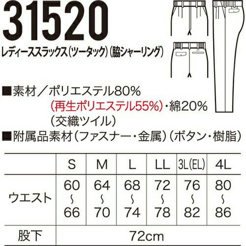 クロダルマ 31520 レディーススラックス 脇ゴム 作業着 ボトムス ワークウエア ワークウェア 作業服(秋冬・通年) パンツ・スラックス 腿ポケット無ズボン 作業服 作 作業ズボン 作業パンツ ワークパンツ ズボン おしゃれ かっこいい オフィス ユニホーム 作業 軽作業 外作業 工場 現場