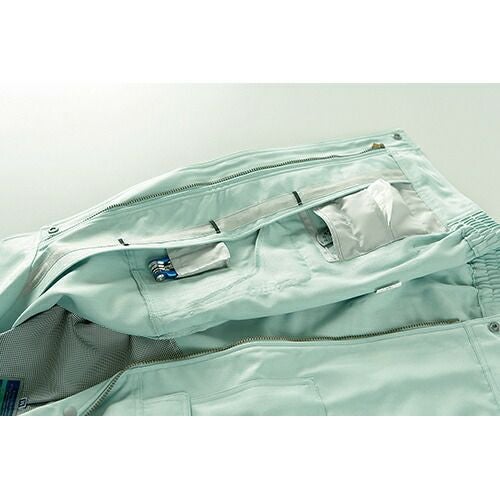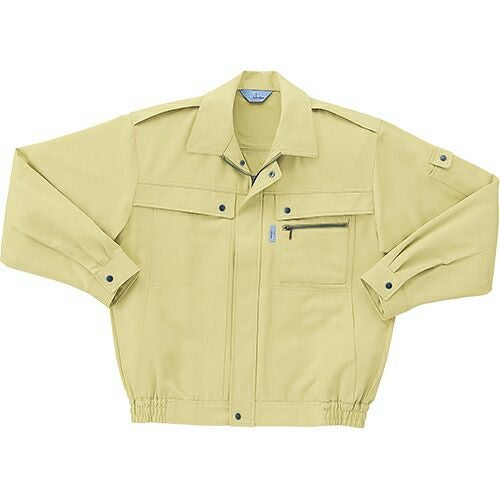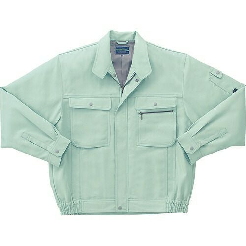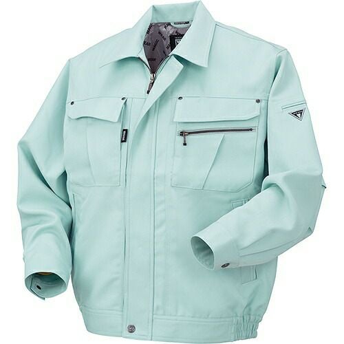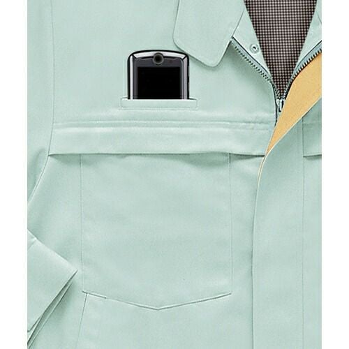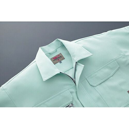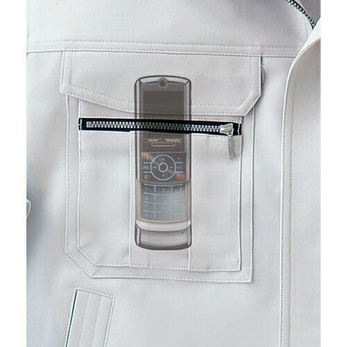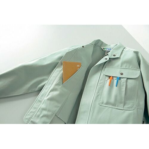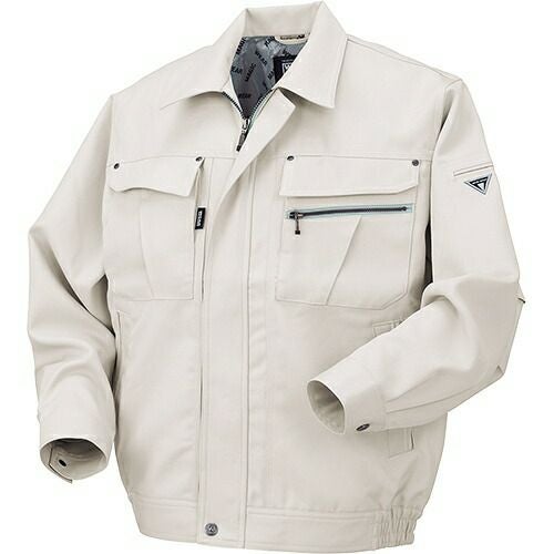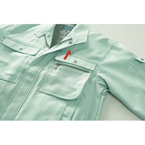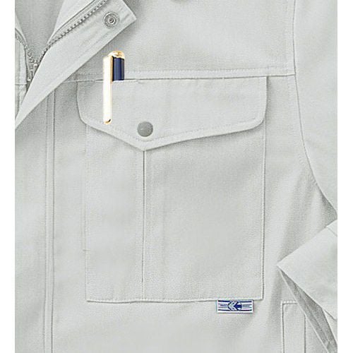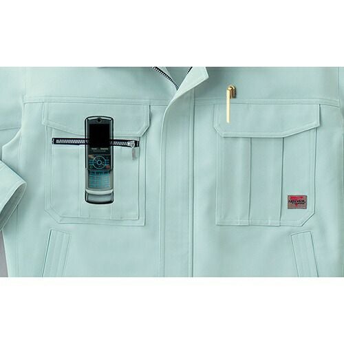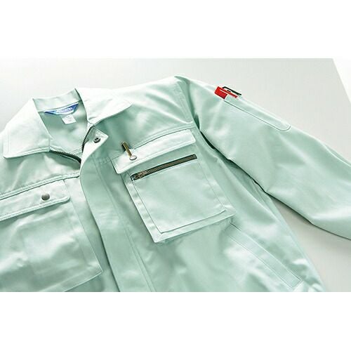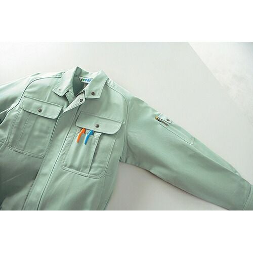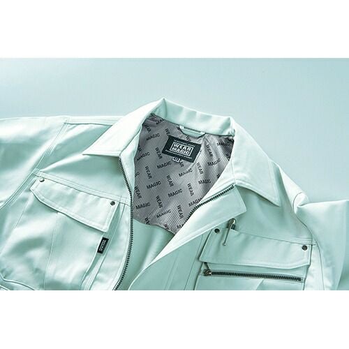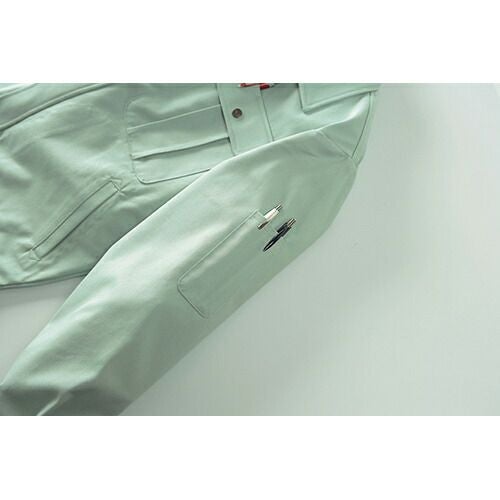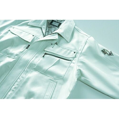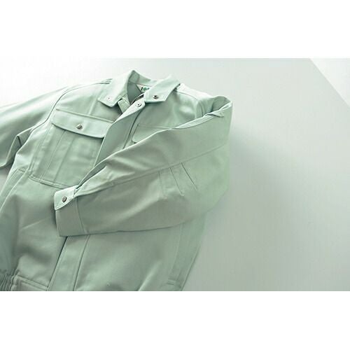 製品洗い加工を施した風合いのある超ストレッチデニムとなっています。伸縮性のあるストレッチ素材を使用しており、ジャンパーの袖内側・パンツの内股ギャザーで抜群の動き易さを実現していますので、激しい現場作業でも邪魔になりません。左袖にはマルチポケットがありますので、現場道具などを持ち歩くのにも大変便利となっています。