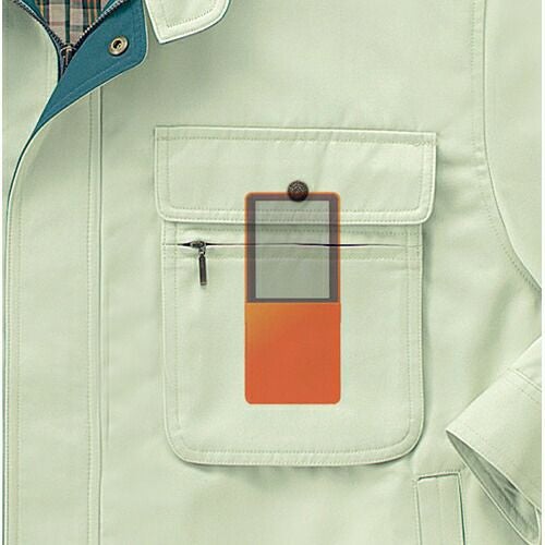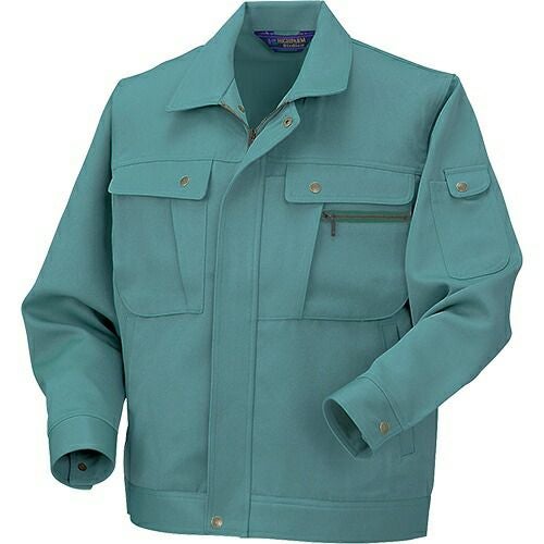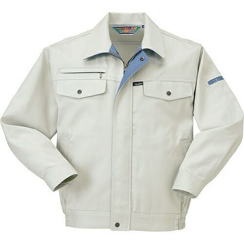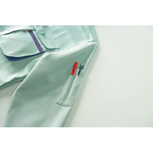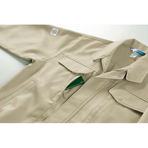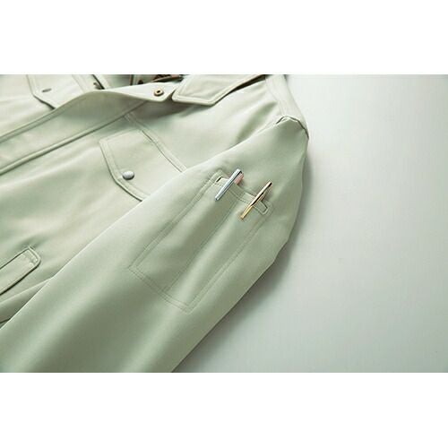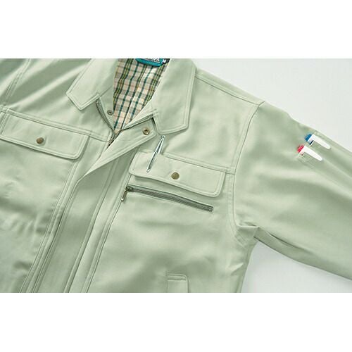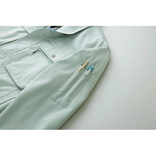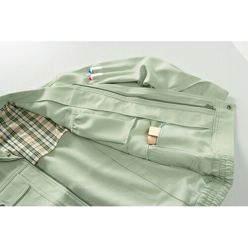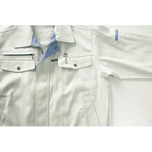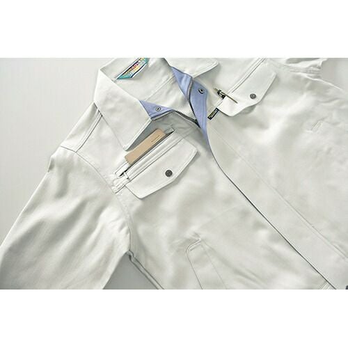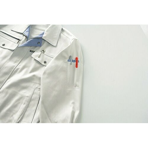 製品洗い加工を施した風合いのある超ストレッチデニムとなっています。伸縮性のあるストレッチ素材を使用しており、ジャンパーの袖内側・パンツの内股ギャザーで抜群の動き易さを実現していますので、激しい現場作業でも邪魔になりません。左袖にはマルチポケットがありますので、現場道具などを持ち歩くのにも大変便利となっています。