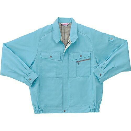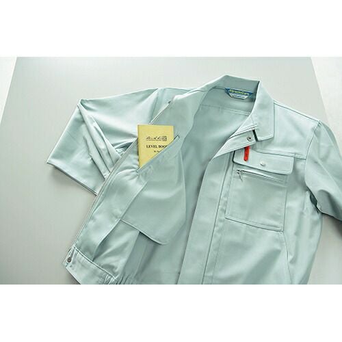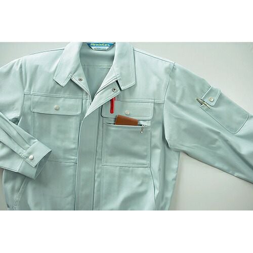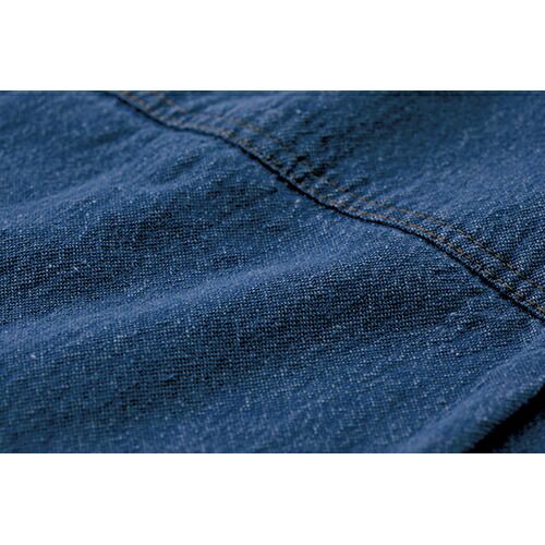 製品洗い加工を施した風合いのある超ストレッチデニムとなっています。伸縮性のあるストレッチ素材を使用しており、ジャンパーの袖内側・パンツの内股ギャザーで抜群の動き易さを実現していますので、激しい現場作業でも邪魔になりません。左袖にはマルチポケットがありますので、現場道具などを持ち歩くのにも大変便利となっています。