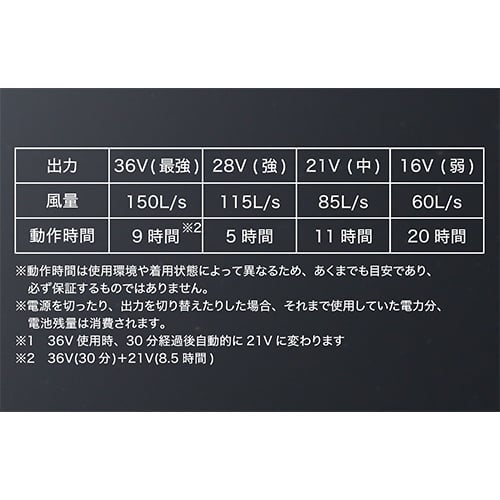 36V 最大風量150L/sのパワーファン&バッテリー新登場! ファンは業界最薄クラスで丸洗い可能の防水キャップ付き。押しやすい大きめボタンの大容量25000mAhバッテリーは、Type-C搭載の急速充電仕様。