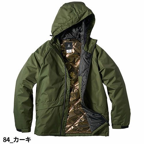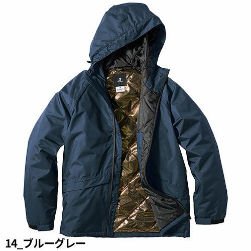 雨の侵入とムレをしっかり防ぐ軽量の防水防寒ユニフォームゴールドアルミプリントが優れた保温性を発揮する冬の現場で大活躍のありてむ