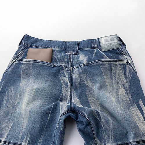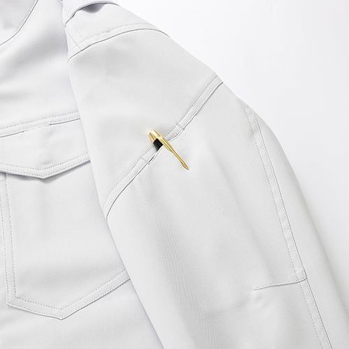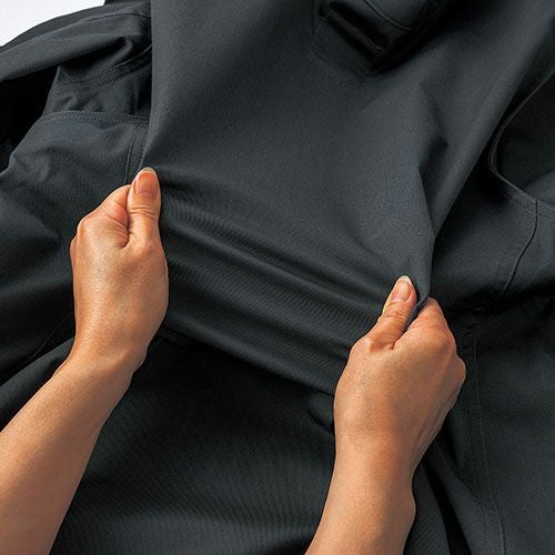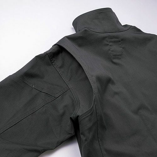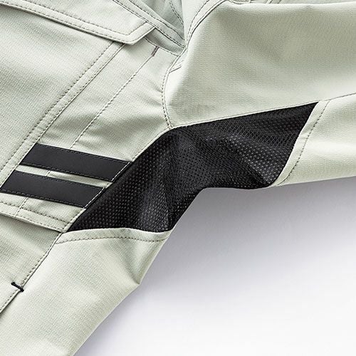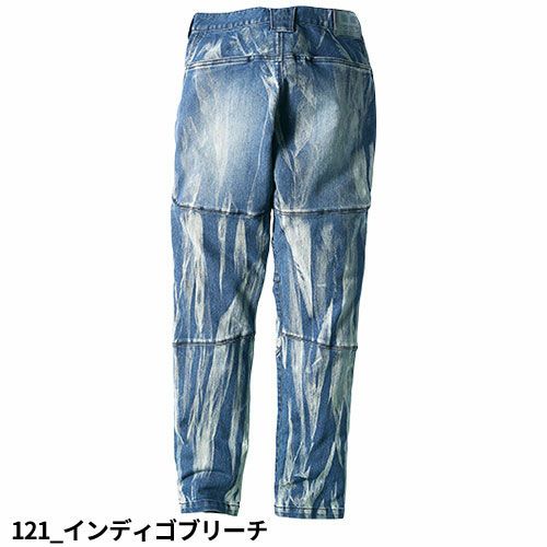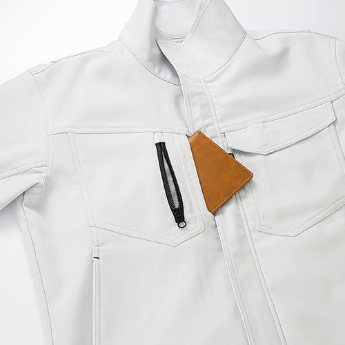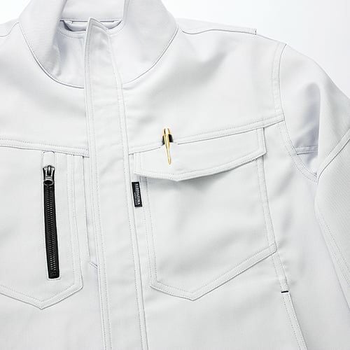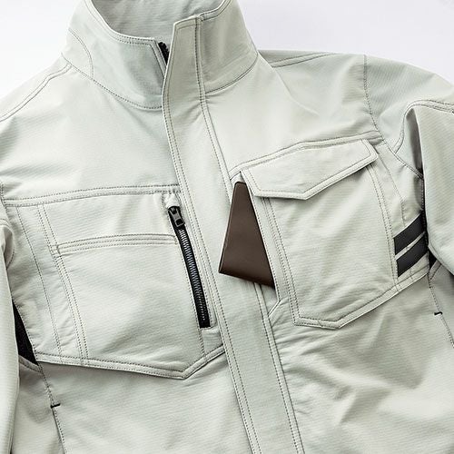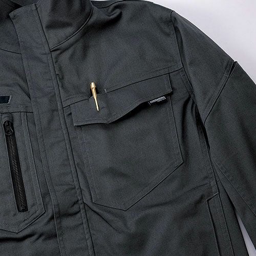 製品洗い加工を施した風合いのある超ストレッチデニムとなっています。伸縮性のあるストレッチ素材を使用しており、ジャンパーの袖内側・パンツの内股ギャザーで抜群の動き易さを実現していますので、激しい現場作業でも邪魔になりません。左袖にはマルチポケットがありますので、現場道具などを持ち歩くのにも大変便利となっています。