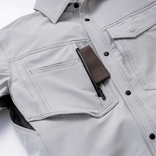 カラーはブルーを基調としており、作業着とは思えないほど非常にデザイン性の高い半袖シャツとなっています。左胸に異素材のファスナーポケットがついた、風合いのいいデニムニットの半袖Tシャツです。また、裾は絞れるようにドローコードが付いていますので、現場作業に応じて絞り込むことも可能です。