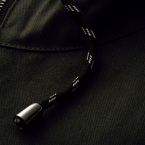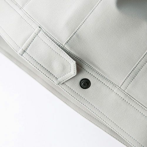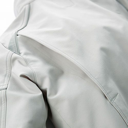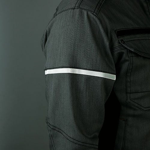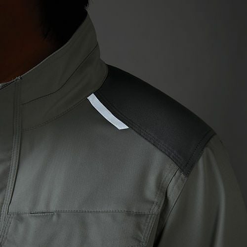 綿混の肉厚でソフトな着用感と伸縮率30%の優れたストレッチ性を両立する高機能素材。摩擦や日光による退色が少なく製造過程での環境への影響も少ない「黒原着糸」を仕様。 伸縮率30%のストレッチ素材で動きやすさをサポート。右胸にはエンボスファスナー、右袖には反射テープを採用。