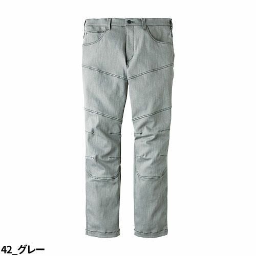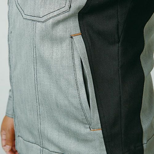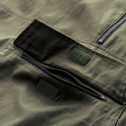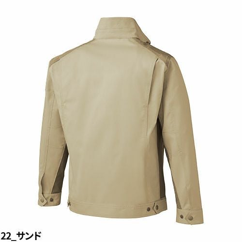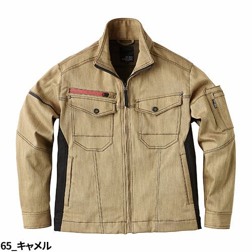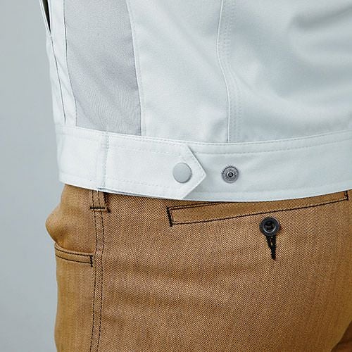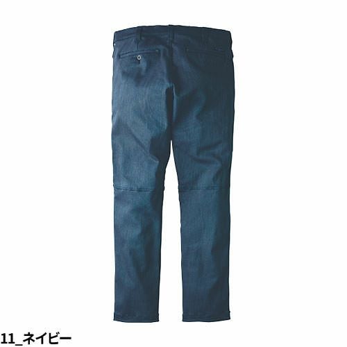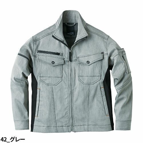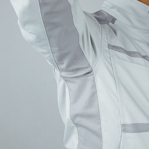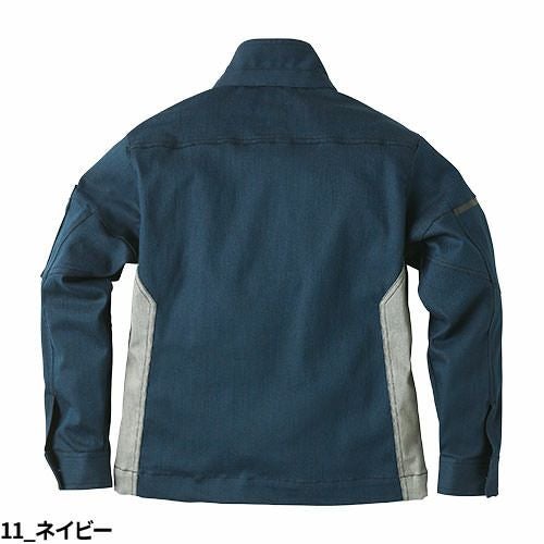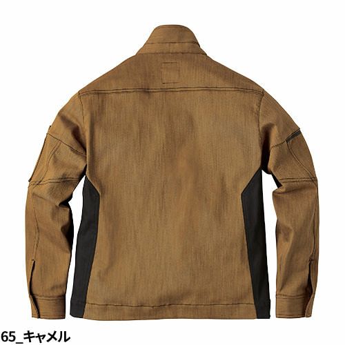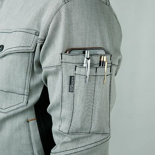 製品洗い加工を施した風合いのある超ストレッチデニムとなっています。伸縮性のあるストレッチ素材を使用しており、ジャンパーの袖内側・パンツの内股ギャザーで抜群の動き易さを実現していますので、激しい現場作業でも邪魔になりません。左袖にはマルチポケットがありますので、現場道具などを持ち歩くのにも大変便利となっています。