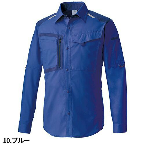 カラーはブルーを基調としており、作業着とは思えないほど非常にデザイン性の高い半袖シャツとなっています。左胸に異素材のファスナーポケットがついた、風合いのいいデニムニットの半袖Tシャツです。また、裾は絞れるようにドローコードが付いていますので、現場作業に応じて絞り込むことも可能です。