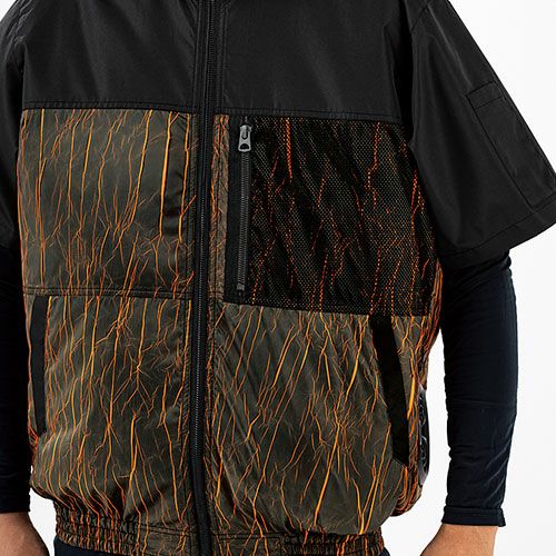 車両運転時にも邪魔にならないサイドファン仕様のベスト 背中内側に保冷剤を収納できるポケットも装置して快適さアッププリーツ加工の素材を使用