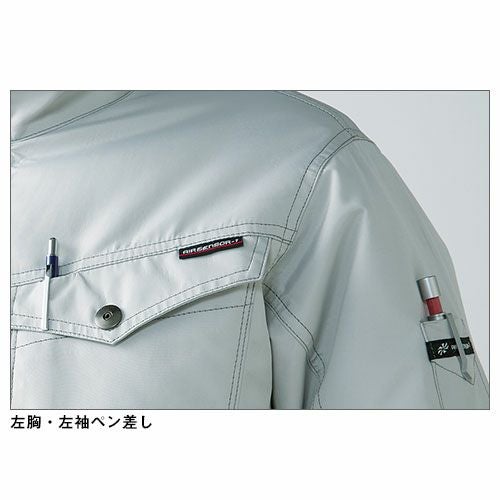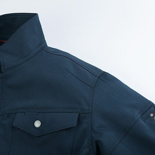 製品洗い加工を施した風合いのある超ストレッチデニムとなっています。伸縮性のあるストレッチ素材を使用しており、ジャンパーの袖内側・パンツの内股ギャザーで抜群の動き易さを実現していますので、激しい現場作業でも邪魔になりません。左袖にはマルチポケットがありますので、現場道具などを持ち歩くのにも大変便利となっています。