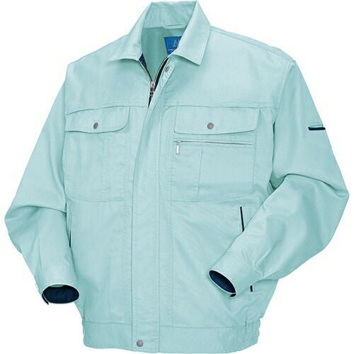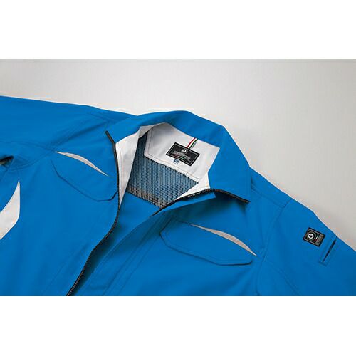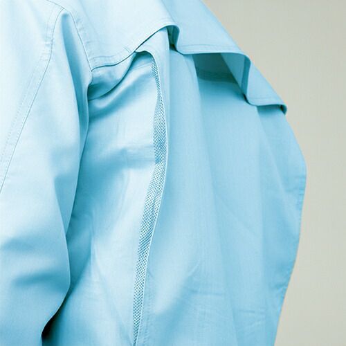 静電気による誤動作を防ぐ「静電気帯電防止作業服」規格適合品 表目と裏目をタテ・ヨコ交互に組み合わせて編んだ「鹿の子」生地表面に隆起や透かし目を作り、肌への接面積が少なく、さらりとした風合いと優れた通気性が特長手がスムーズに動かせる「リラックスカット」や、首周りの汗の臭いを軽減する「衿消臭テープ」採用