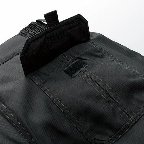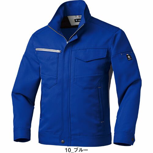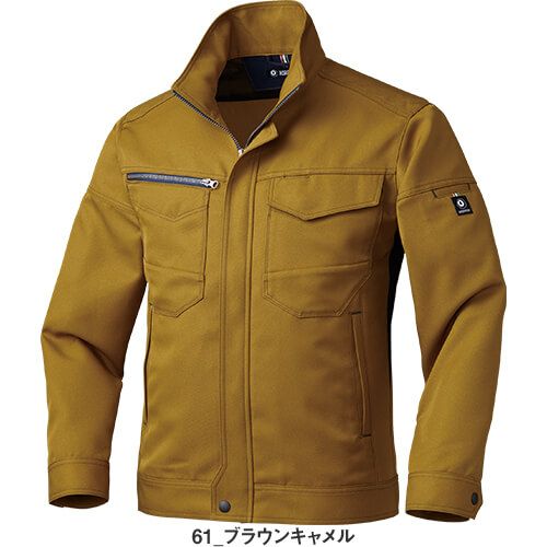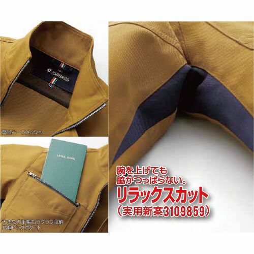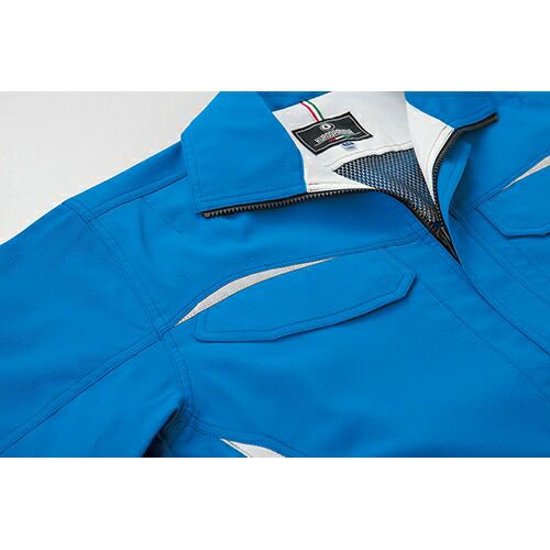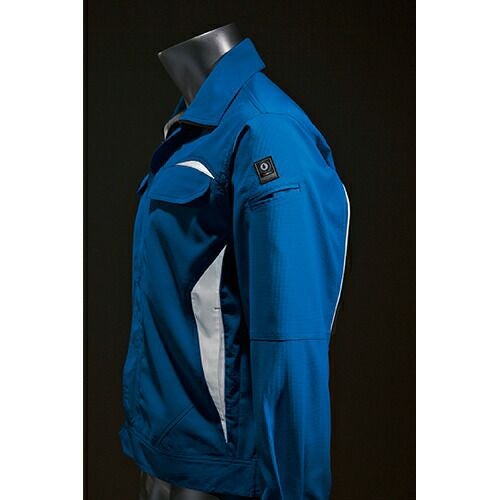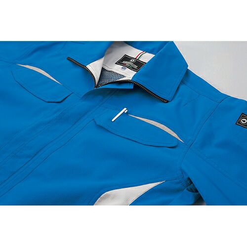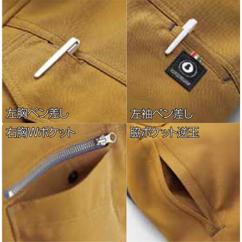 製品洗い加工を施した風合いのある超ストレッチデニムとなっています。伸縮性のあるストレッチ素材を使用しており、ジャンパーの袖内側・パンツの内股ギャザーで抜群の動き易さを実現していますので、激しい現場作業でも邪魔になりません。左袖にはマルチポケットがありますので、現場道具などを持ち歩くのにも大変便利となっています。