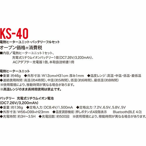 他の画像を見る 電熱ウェア クロダルマ 電熱ヒーターユニット KS-41 作業着 作業服 防寒 暖かい 温度調整可 寒さ 冬対策 特別価格 ¥ 1,617 税込 手動はもちろんスマートフォンのブルートゥース機能でも電源や温度調整などのコントロールが可能!・ワンタッチで取付け簡単・過熱を防ぐ安全装置付きで安心・使用環境に合わせて最適な温度を選べる4段階温度調整機能付き ※使用できる互換バッテリーは以下の通りです。KS-42(電熱ウェア バッテリー・充電セット)KS-32(AIR SENSOR-1 KS-30シリーズ バッテリーセット) カートに入れる お気に入りに登録する