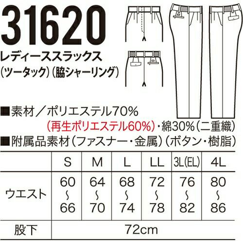 他の画像を見る クロダルマ 31620 レディーススラックス(ツータック 脇ゴム) 作業着 ボトムス ワークウエア レディーススラックス(ツータック)(脇ゴム) ワークウェア 作業服(春夏) パンツ・スラックス レディースパンツ 特別価格 ¥ 3,850 税込 〜 特別価格 ¥ 税込 詳細を見る お気に入りに登録する