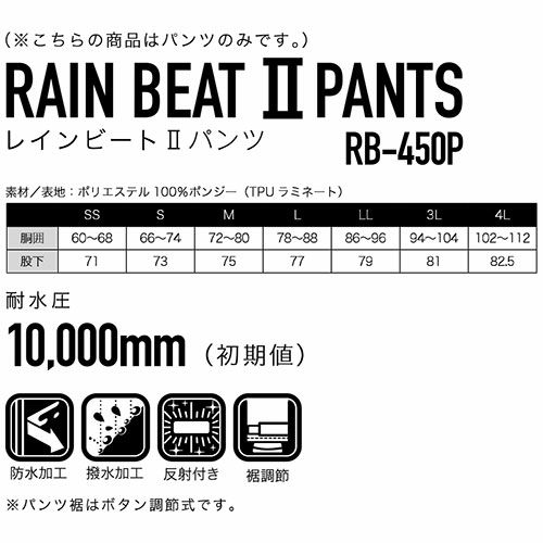 他の画像を見る レインパンツ コヤナギ RAIN BEAT II レインビート2パンツ RB-450P レインウエア 合羽 カッパ 通勤 通学 自転車 バイク 農作業 旅行 登山 トレッキング ハイキング スポーツ観戦 野外フェス 特別価格 ¥ 1,466 税込 「パンツだけ」の声を実現しました。 「雨の侵入を防ぐ」合羽として必要な機能は守りながら思い切ったコストダウンでコヤナギ最安値のベーシックレインパンツ 在庫切れ 詳細を見る お気に入りに登録する