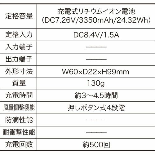 他の画像を見る EFウェア バッテリー クロダルマ AIR SENSOR KS-250シリーズ リチウムイオンバッテリー 2025年モデル KS-254 KS-254 作業着 作業服 春夏EFウェア バッテリー 特別価格 ¥ 9,800 税込 圧倒的に便利な洗える高風量106Lファンがついにクロダルマからも登場!! ■ファン(風量、連続稼働時間)弱:56L/s・約20時間、中:78L/s、約8.5時間、強:95L/s、約5時間、最強:106L/s、約8時間ファン質量(1個):88g■バッテリー出力弱:10V、中:14V、強:17V、最強:20V■充電式リチウムイオン電池(DC18.5V/3350mAh/61.97Wh)重量:約319g外形寸法:W75×D27×H115mm充電時間:約3.5時間充電回数:約500回定格入力:DC21V/1500mA 在庫切れ 再入荷お知らせ お気に入りに登録する