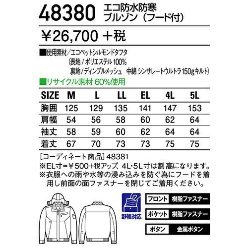他の画像を見る 自重堂 ブルゾン(フード付) 防寒ジャケット ドカジャン 保温 人気 安い ダウン 防寒着 防寒ジャンパー 上着 ブルゾン 最強 アウター おしゃれ 暖かい 秋冬 かっこいい 作業着 ワーク マン メンズ 寒さ対策 屋内作業 屋外作業 あったか 防寒グッズ 48380 特別価格 ¥ 16,841 税込 〜 特別価格 ¥ 税込 耐水圧10,000 mm+ シンサレートウルトラ使用のハイブリッドエコ防水防寒。 軽量ながら十分な温かさをキープしたエコ防水防寒。中綿にシンサレートウルトラを使用。 詳細を見る お気に入りに登録する