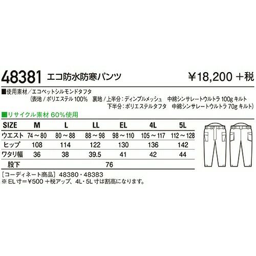 他の画像を見る 自重堂 パンツ 防寒パンツ ワークパンツ 防寒 ズボン 保温 人気 安い 防寒着 おしゃれ 暖かい 秋冬用 最強 かっこいい 作業着 おすすめ ワーク マン メンズ カジュアル 定番 寒さ対策 防寒ウェア 屋外作業 屋内作業 あったか シンプル 48381 特別価格 ¥ 11,473 税込 〜 特別価格 ¥ 税込 耐水圧10,000 mm+ シンサレートウルトラ使用のハイブリッドエコ防水防寒。 軽量ながら十分な温かさをキープしたエコ防水防寒。中綿にシンサレートウルトラを使用。 詳細を見る お気に入りに登録する