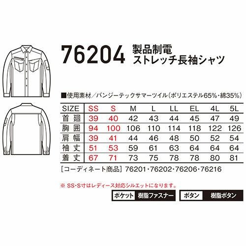 作業服 長袖シャツ 自重堂 Z-DRAGON 製品制電ストレッチ長袖シャツ 76204 作業着 春夏帯電防止 ストレッチ 消臭 抗菌
