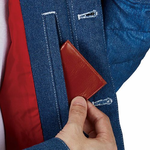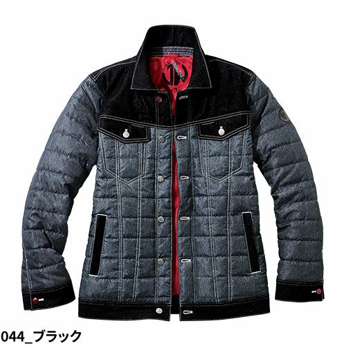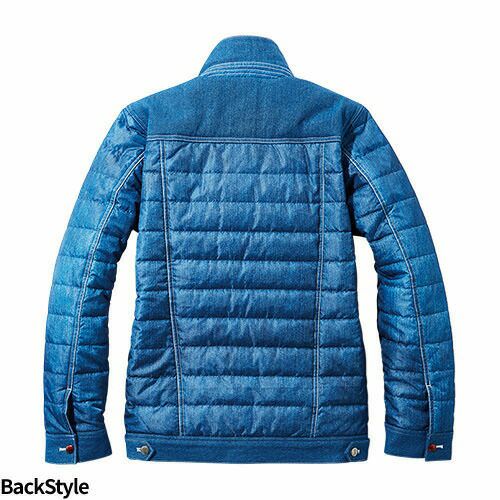 カジュアルテイスト防寒ジャンパーデニム生地とデニムプリント生地を組み合わせてデザイン性を追求した防寒ジャンパー