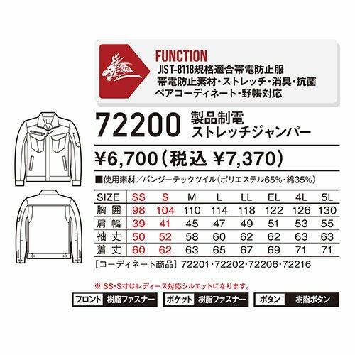 作業服 ブルゾン 自重堂 Z-DRAGON 製品制電ストレッチジャンパー 72200 作業着 通年 秋冬 帯電防止 ストレッチ 消臭 抗菌 男女共用 おしゃれ かっこいい 人気 ワーク企業 法人 作業 工場 外作業