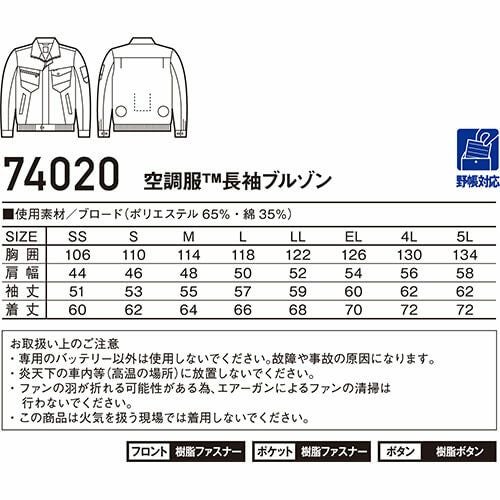 空調服 長袖ブルゾン Z-DRAGON 服のみ 74020 作業着 作業服 春夏 メンズ 涼しい 快適 猛暑対策 熱中症対策 上着 ジャケット 扇風機作業服 工事 土木 土建 建設 外作業 炎天下