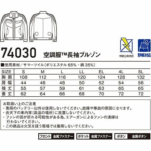 空調服 長袖ブルゾン Z-DRAGON 服のみ 74030 作業着 作業服 春夏 メンズ 涼しい 快適 猛暑対策 熱中症対策 上着 ジャケット 扇風機作業服 工事 土木 土建 建設 外作業 炎天下