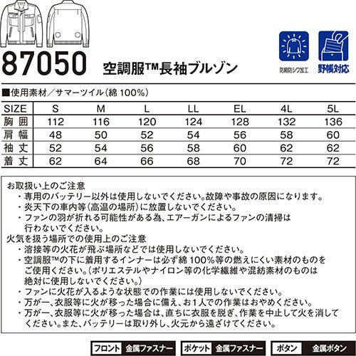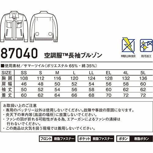 空調服 自重堂 空調服長袖ブルゾン服のみ 87040 作業着 作業服 春夏 メンズ 涼しい 快適 猛暑対策 熱中症対策 上着 ジャケット 扇風機作業服 工事 土木 土建 建設 外作業 炎天下