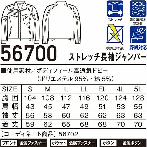 作業服 ジャンパー 自重堂 Jawin ストレッチ長袖ジャンパー 56700 作業着 春夏 メンズ レディース 人気 上下セット対応 制服 企業ユニフォーム 工事 土木 溶接 塗装 工場 電気工事 土建 建設 建築 設備 動きやすい 伸縮性