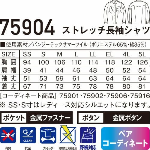 作業服 長袖シャツ 自重堂 Z-DRAGON ストレッチ長袖シャツ 75904 作業着 春夏 メンズ レディース 人気 上下セット対応 制服 企業ユニフォーム 工事 土木 塗装 工場 電気工事 土建 建設 建築 設備 動きやすい 伸縮性 ペアユニフォーム