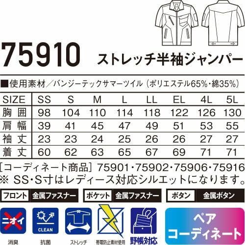 作業服 ジャンパー 自重堂 Z-DRAGON ストレッチ半袖ジャンパー 75910 作業着 春夏 メンズ レディース 人気 上下セット対応 制服 企業ユニフォーム 工事 土木 塗装 工場 電気工事 土建 建設 建築 設備 動きやすい 伸縮性 ペアユニフォーム