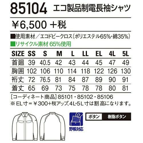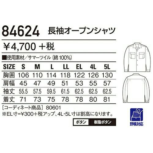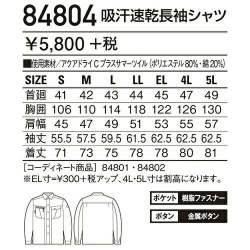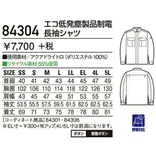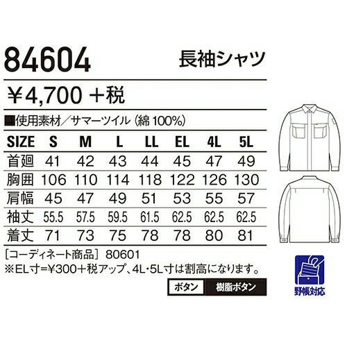 自重堂 作業服 84304 長袖シャツ 春夏 ユニセックス 作業着 長袖 ワークウエア ワークシャツ