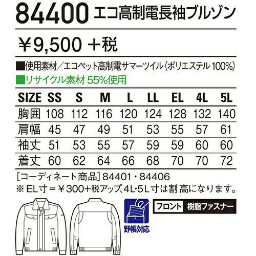 自重堂 作業服 84400 長袖ブルゾン 春夏 ユニセックス 作業着 ワークウエア ブルゾン