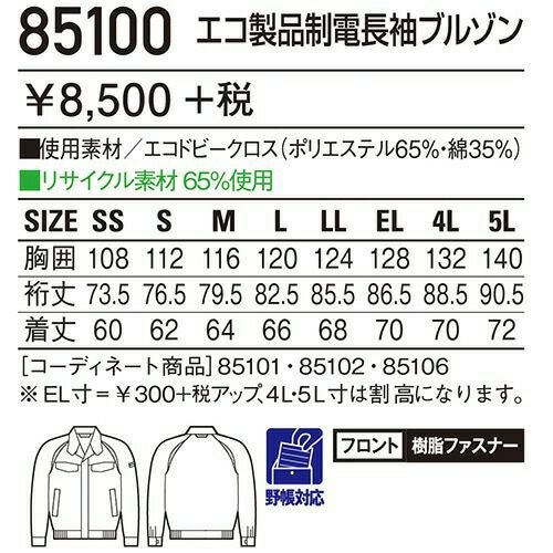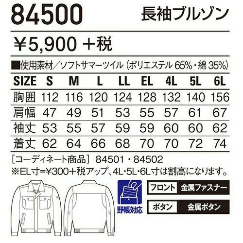 自重堂 作業服 84500 長袖ブルゾン 春夏 メンズ 作業着 ワークウエア ブルゾン