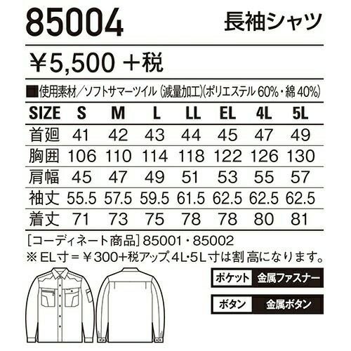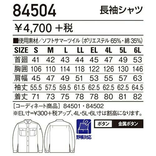 自重堂 作業服 84504 長袖シャツ 春夏 メンズ 作業着 長袖 ワークウエア ワークシャツ