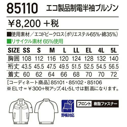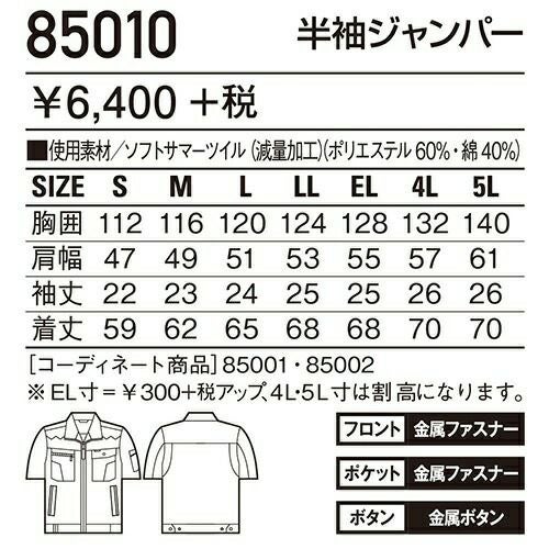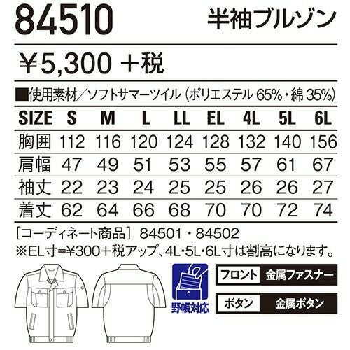 自重堂 作業服 84510 半袖ブルゾン 春夏 メンズ 作業着 ワークウエア ブルゾン