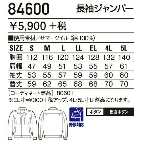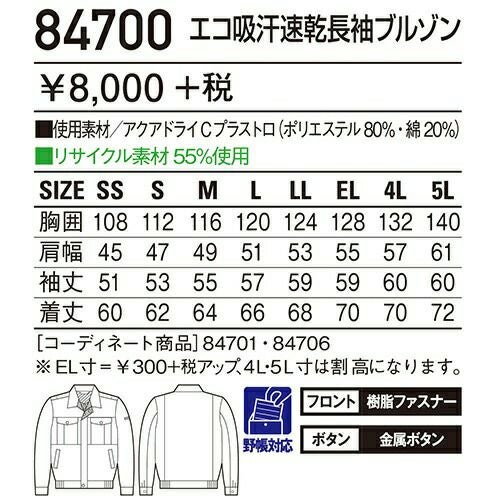 自重堂 作業服 84700 長袖ブルゾン 春夏 ユニセックス 作業着 ワークウエア ブルゾン