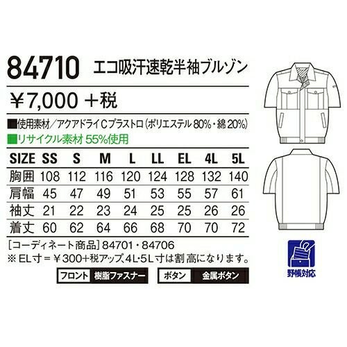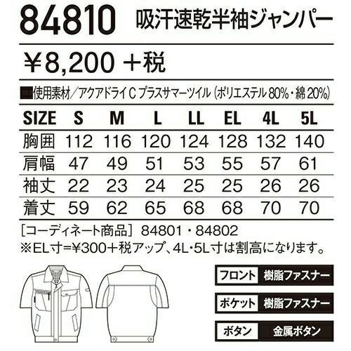 自重堂 作業服 84710 半袖ブルゾン 春夏 ユニセックス 作業着 ワークウエア ブルゾン