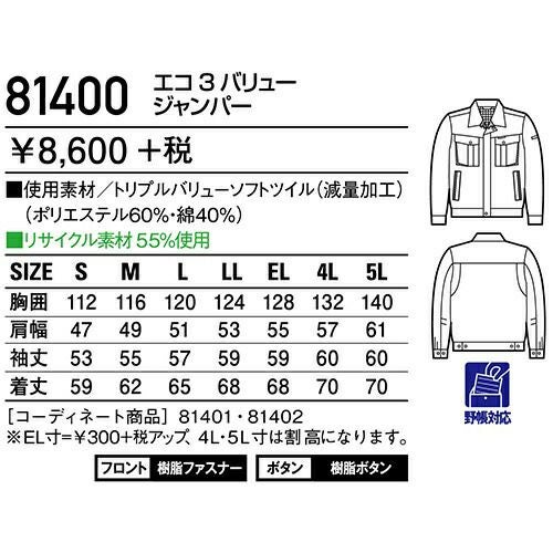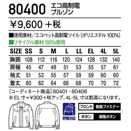 自重堂 作業服 80400 ブルゾン 秋冬 メンズ 作業着 ワークウエア 通年 上着 おしゃれ かっこいい 人気 企業 法人 ワーク 作業 工場 外作業 ワークユニフォーム 仕事 土木 工事 現場