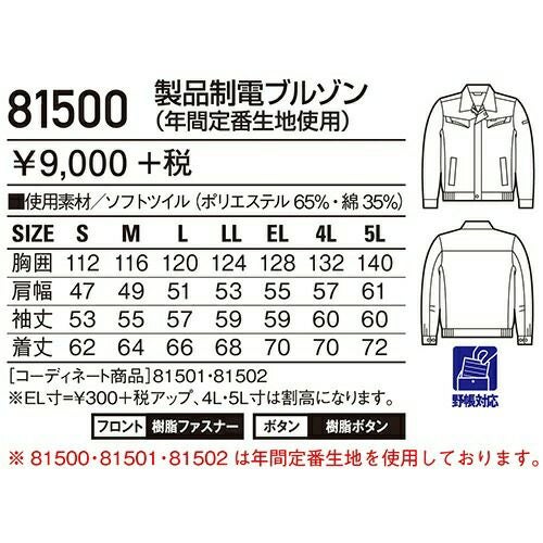 自重堂 作業服 81500 ブルゾン 秋冬 メンズ 作業着 ワークウエア 通年 上着 おしゃれ かっこいい 人気 企業 法人 ワーク 作業 工場 外作業 ワークユニフォーム 仕事 土木 工事 現場