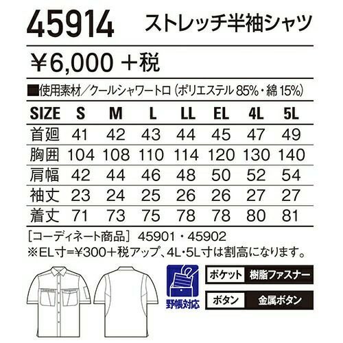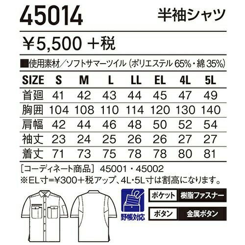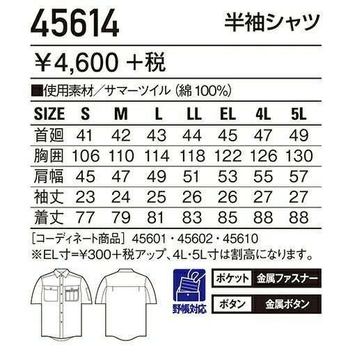 自重堂 作業服 45914 半袖シャツ 春夏 メンズ 作業着 半袖 ワークウエア ワークシャツ