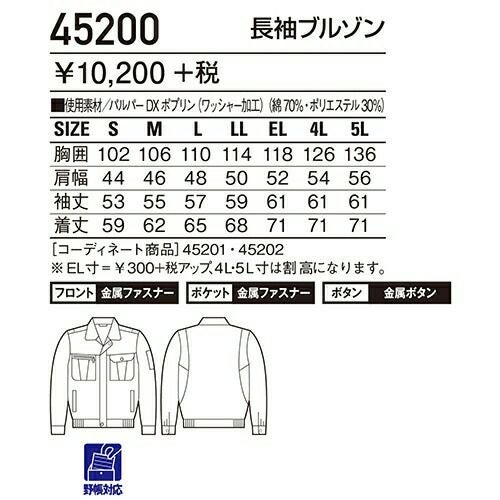 自重堂 作業服 45200 長袖ブルゾン 春夏 メンズ 作業着 ワークウエア ブルゾン