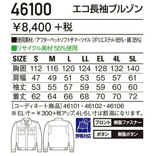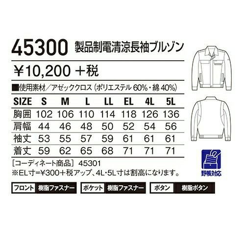 自重堂 作業服 45300 長袖ブルゾン 春夏 ユニセックス メンズ・レディース対応 作業着 ブルゾン