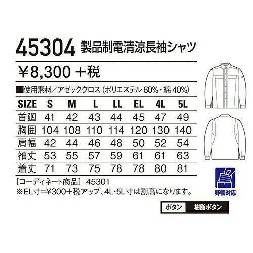 自重堂 作業服 45304 長袖シャツ 春夏 ユニセックス メンズ・レディース対応 作業着 長袖 ワークシャツ
