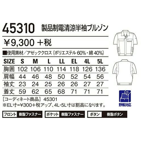 自重堂 作業服 45310 半袖ブルゾン 春夏 ユニセックス メンズ・レディース対応 作業着 ブルゾン