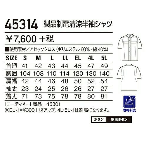 自重堂 作業服 45314 半袖シャツ 春夏 ユニセックス メンズ・レディース対応 作業着 半袖 ワークシャツ